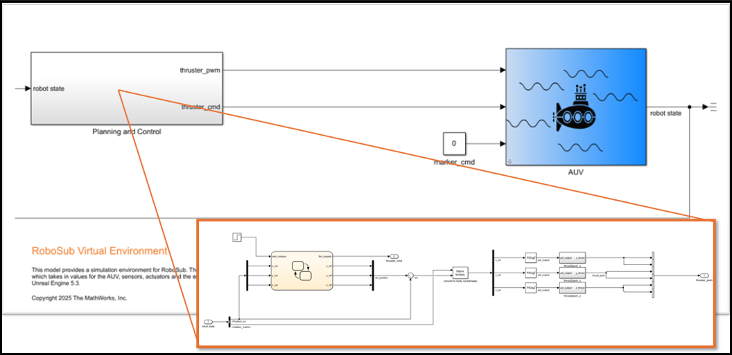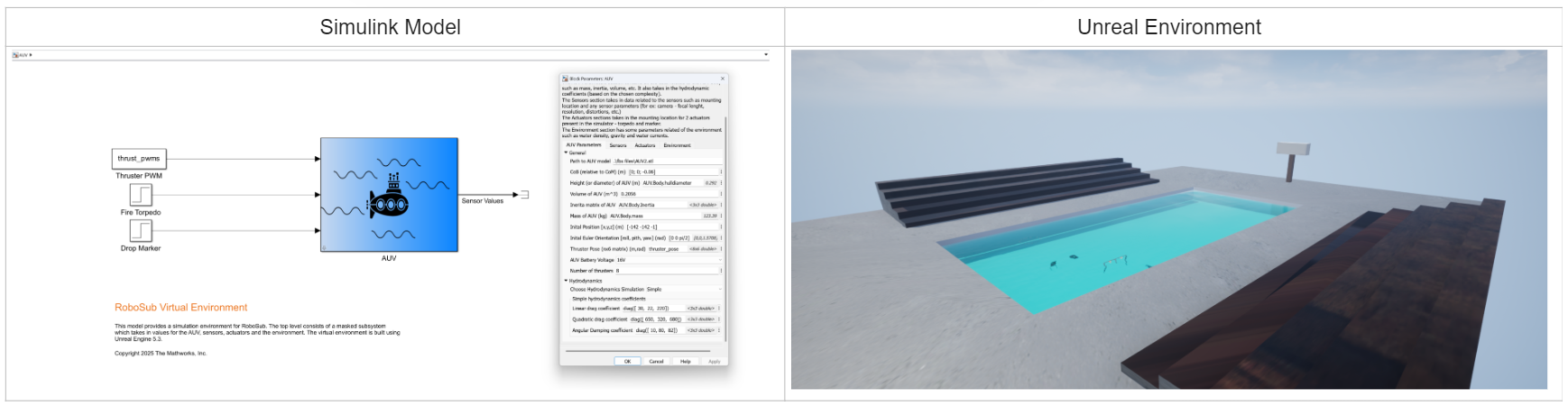 Underwater robotics has been on the rise over the past few years, which reflects the rise in robotics in general. While it might appear to be a niche area, there are several areas in science and engineering that benefit from autonomous underwater vehicles (AUV) such as marine biology (collecting samples, tagging endangered animals, etc.), ship inspection and maintenance, deep sea exploration, military, etc. Seeing the potential impact of AUV is such areas, there have been several competitions to push the development of AUV’s. One such competition is RoboSub – an underwater robotics competition held by RoboNation. The competition pushes the participants to develop vision, navigation and control systems to perform several challenging tasks such as object avoidance, object detection, station keeping, localization and so on. The challenges come in various forms when underwater – lack of GPS is a main factor since the AUV must now use only on board sensors to localize itself, no help from satellites. Vision can also be tricky underwater due to distortions and reduced visibility the deeper the AUV dives. Further, the cost of development and testing increases quickly with the need of water proof bodies, underwater thrusters, expensive sensors such as DVL’s (Doppler Velocity Logger) and access to a pool or a lake for testing. Weather also plays a role as teams in the northern hemisphere have to deal with frozen lakes during winter, which reduces testing time by up to 4 months. To address some of these issues, we have now released a virtual environment to simulate the tasks at RoboSub. Simulation helps identify issues early, reduce development time, cost, and risk in the model-based design workflow. The environment is built in MATLAB 2025b and uses Simulink 3D Animation for photorealistic visualization while the physics are simulated in Simulink. The virtual environment can be cloned from this repository, and will be used for a virtual RoboSub competition in 2026.