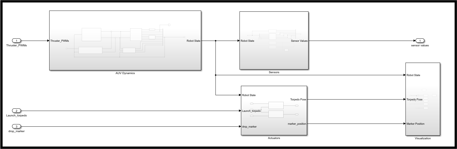 The Simulink model is at the heart of the virtual environment. The AUV block, which is a masked subsystem, takes in the properties of the AUV such as its mass, inertia, volume, thruster positions, sensor positions and actuators to simulate the physics of the body. The model calculates the AUV dynamics based on hydrostatic and hydrodynamic forces and computes the forces and moments from the thrusters. These are then fed into a 6-DOF block that computes the vehicle states (position, velocity, orientation, angular velocity) at each time step. The model breakdown is shown in the image below.