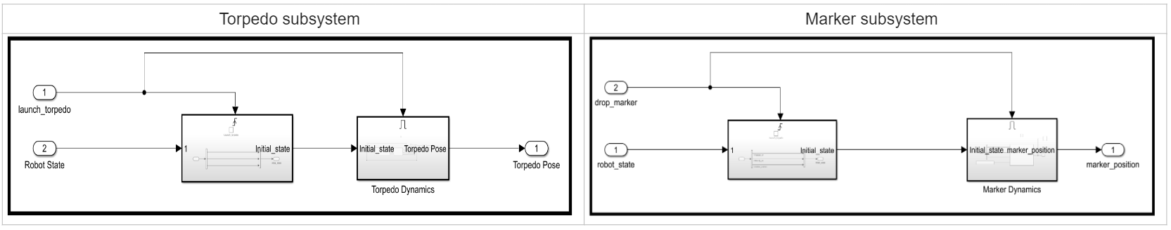 The sensor block takes in the robot state and simulates the reading of common underwater sensors such as IMU, DVL and camera. More sensors can be modeled as and when required by the user. The sensor readings are then the outputs from the AUV block. The noise profiles of these sensors can be edited to match the sensor the user is using to make the simulation more realistic and potentially reduce the sim-to-real gap. The actuator subsystem simulates the two main actuators used in RoboSub – torpedoes and marker dropper. These subsystems are shown below. The model simulates the physics of these objects by sampling the position of the AUV at the time of firing and appending the position based on the physics of the object.
