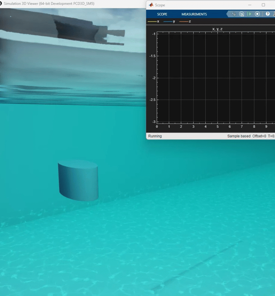 Simulink 3D Animation provides the user with the option to build their custom scene using Unreal Engine (UE). In this virtual environment, the visualization environment is an Olympic sized swimming pool. The features on the pool are modified using UE actors. The water is modeled using the experimental water plugin and the lighting is adjusted through custom shaders to make the underwater view realistic. Below, you can see a gif of the environment and how it interacts with the AUV’s with a positive buoyant force.