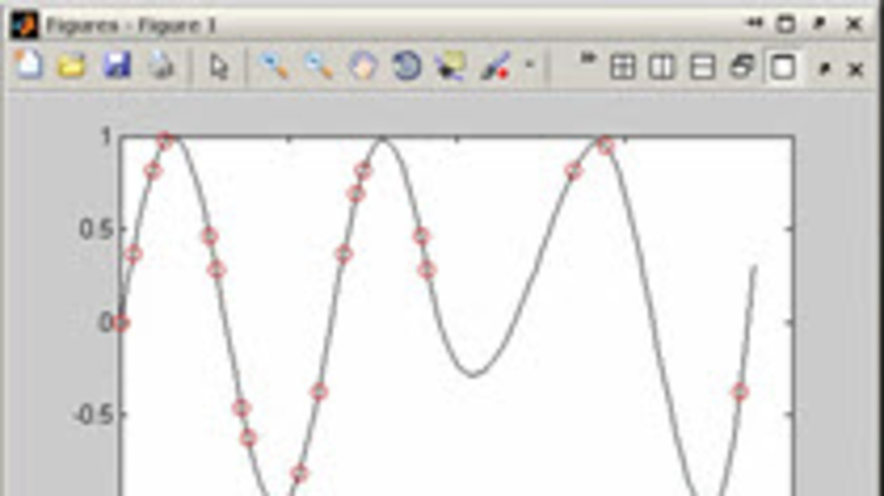 This short video shows how you can take a sparsely sampled sine wave and use interp1 to interpolate the missing data points. Different interpolations such as linear, spline and nearest are all shown…. read more >>